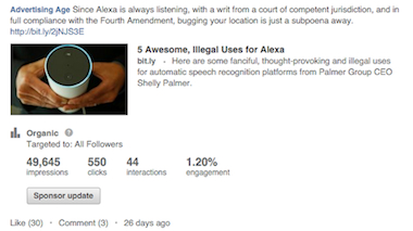 One of the highest performing posts on Ad Age's LinkedIn page in December 2016. Created post in SocialFlow, wrote copy and subhead, scheduled publishing and monitored engagement.